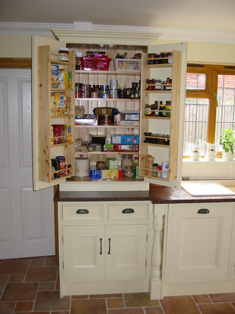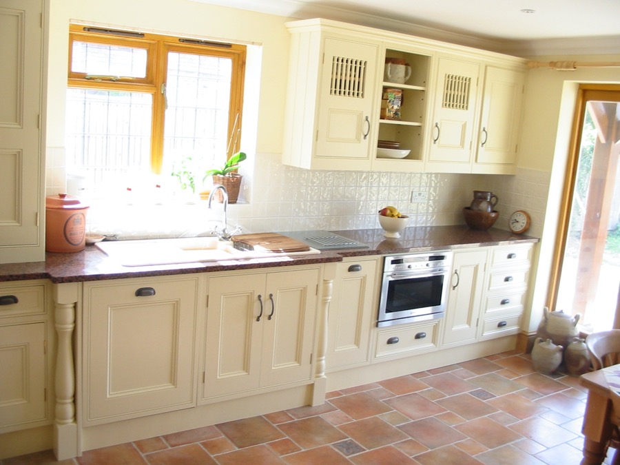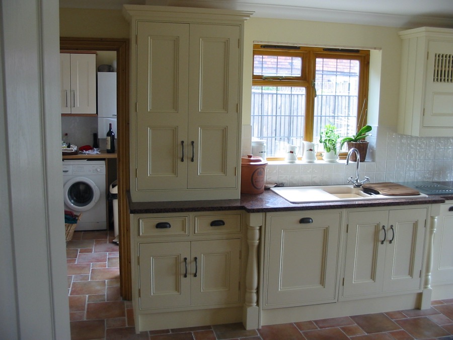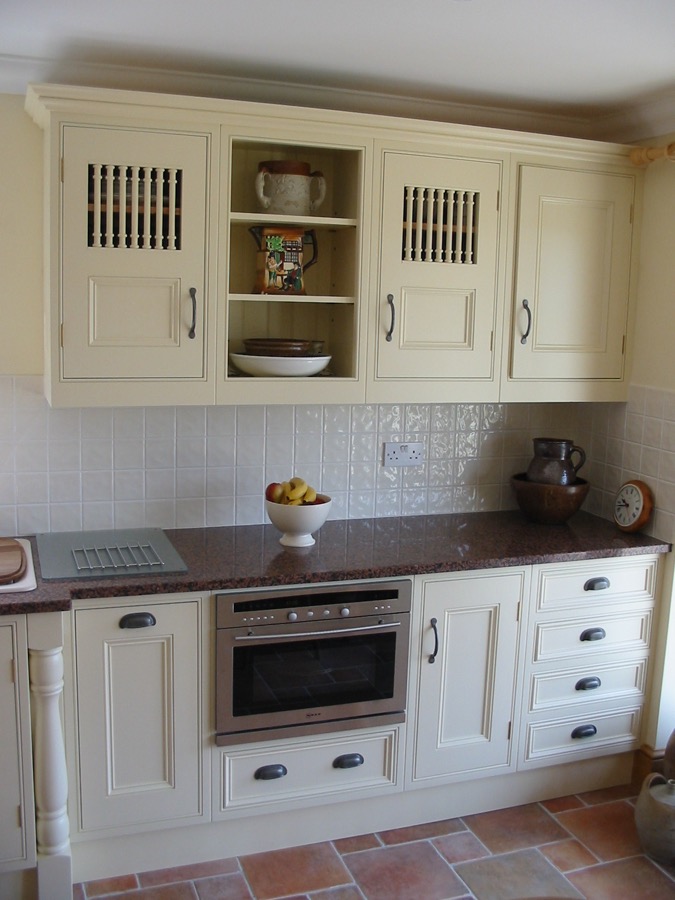 Many kitchens have the doors set into beaded or plain frames, individually constructed for each cabinet with the doors hung on butt hinges. Alternatively doors can be mounted over the fronts of the cabinets with concealed sprung hinges.