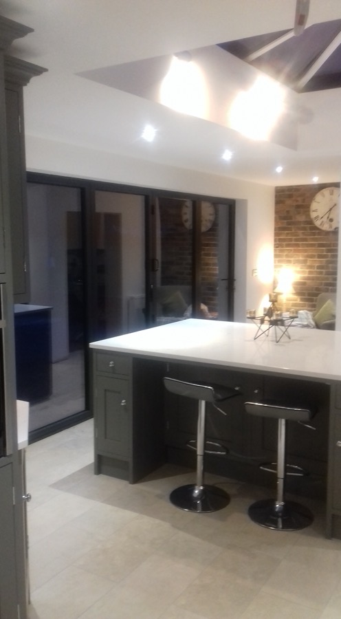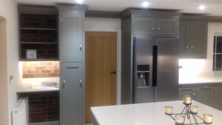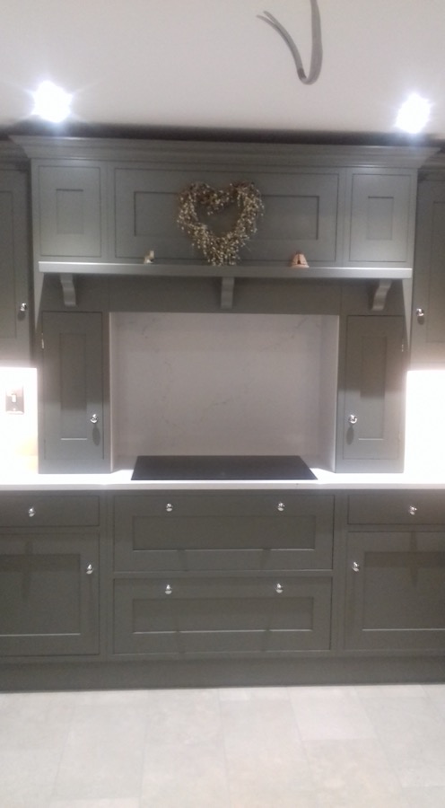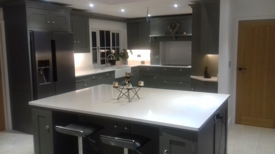 Hand painted shaker style kitchen with quartz worktops.