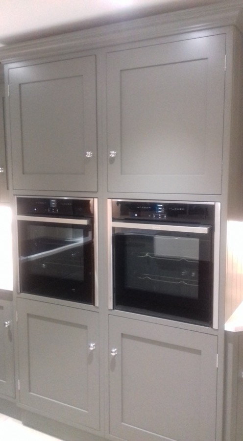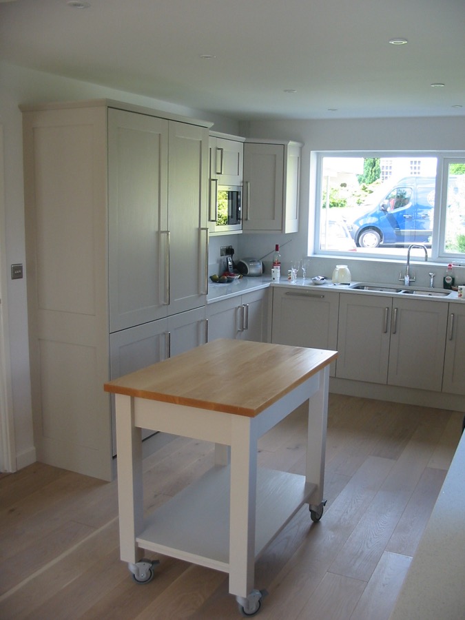 Hand painted shaker style kitchen with oak and Corian worktops.