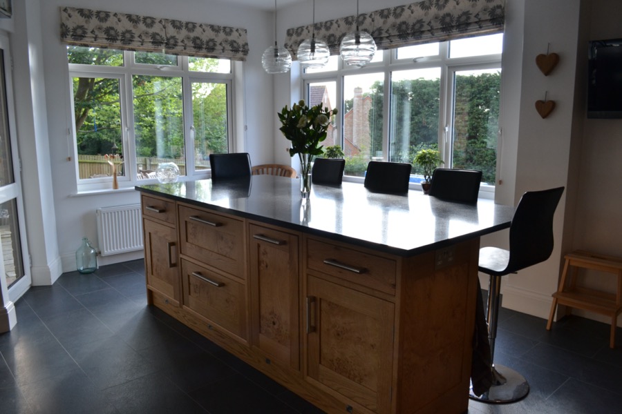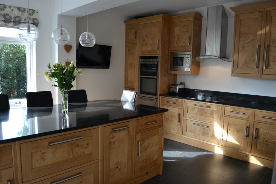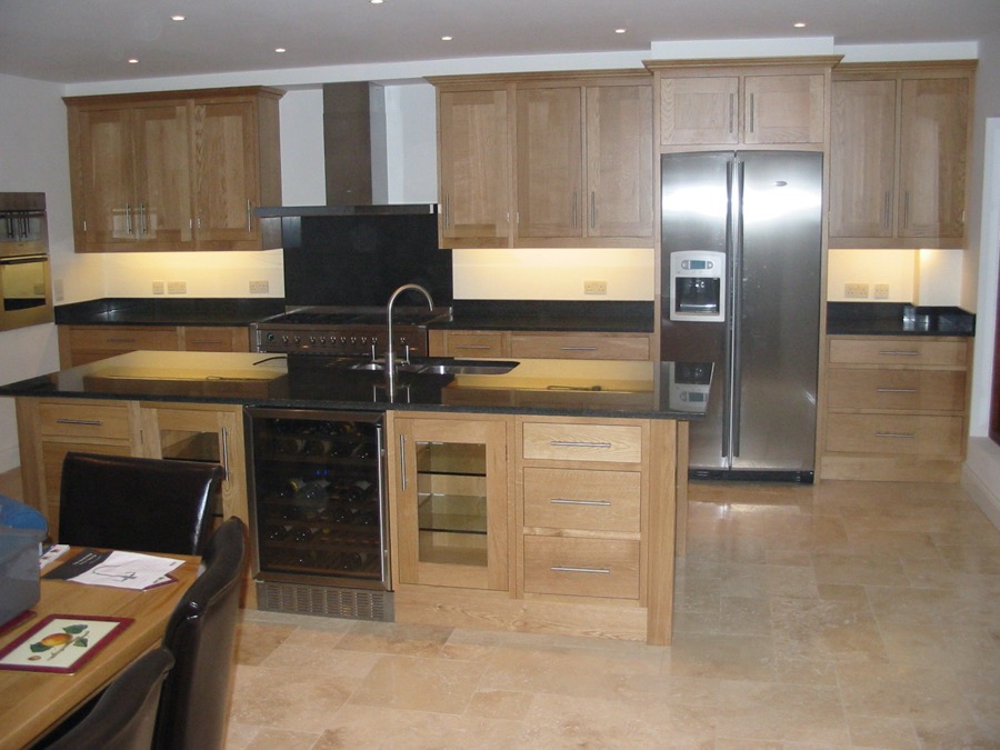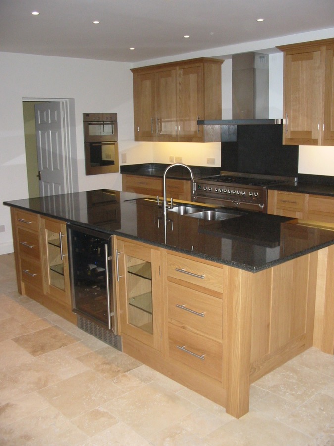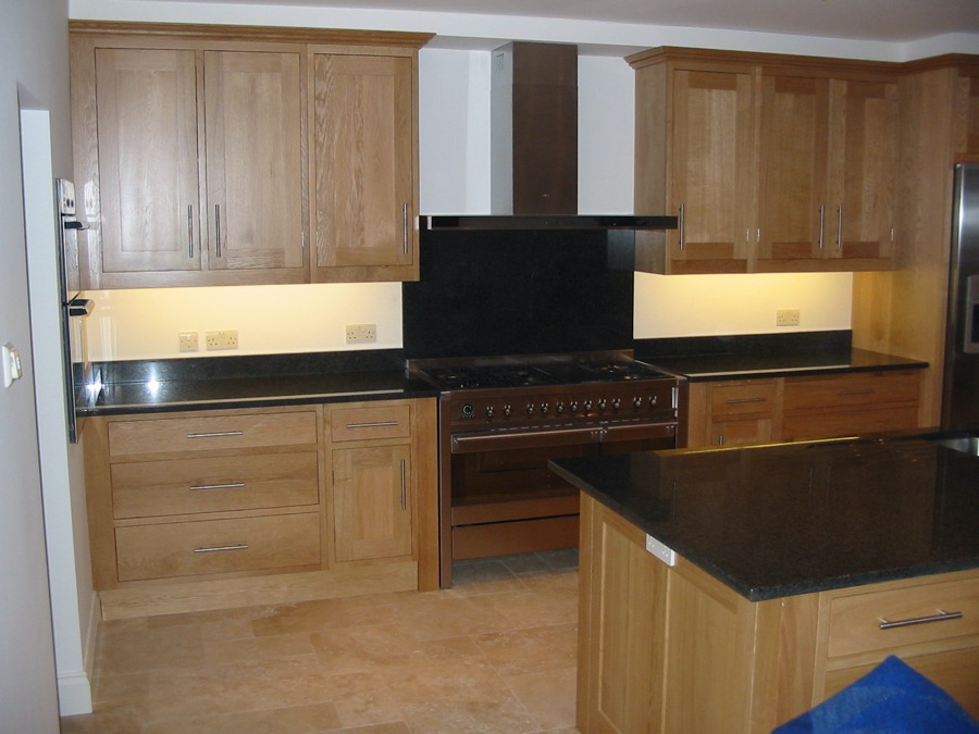 Oak shaker style kitchen with black granite worktops.
