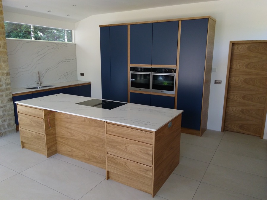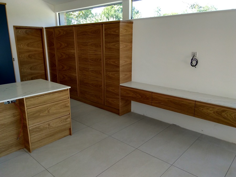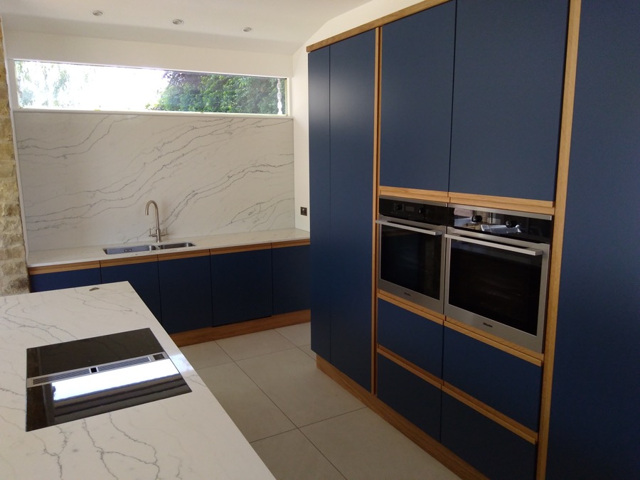 Spray painted and veneered kitchen with quartz worktops.