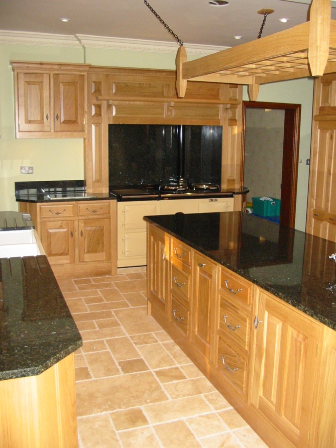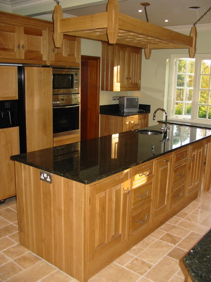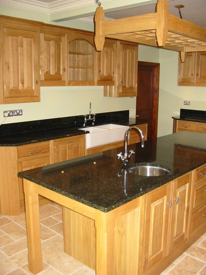 Oak kitchen with pippy oak panels and “Cosmos” granite worktops.