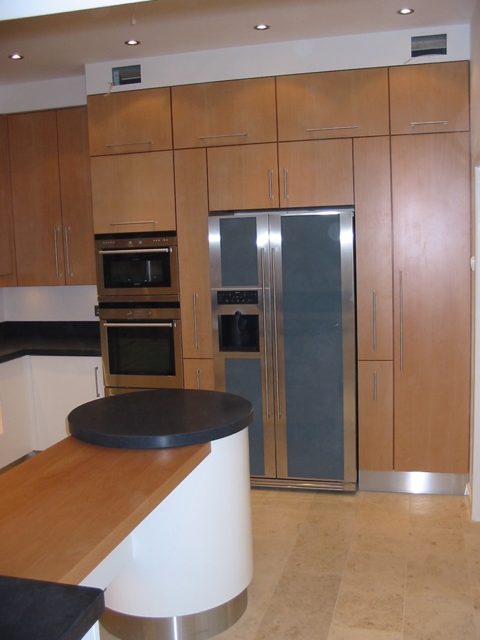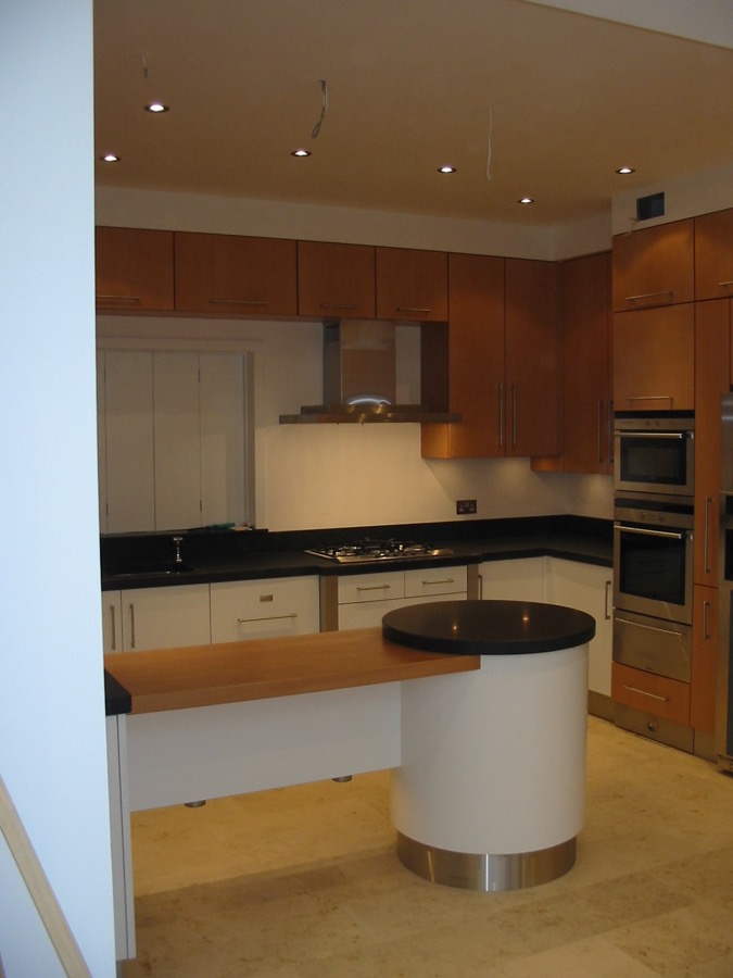 Veneered beech and painted kitchen with granite and beech worktops.