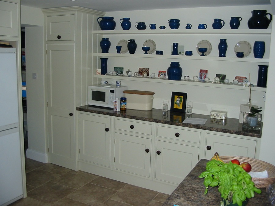 Hand painted kitchen with open shelves and timber door knobs.
