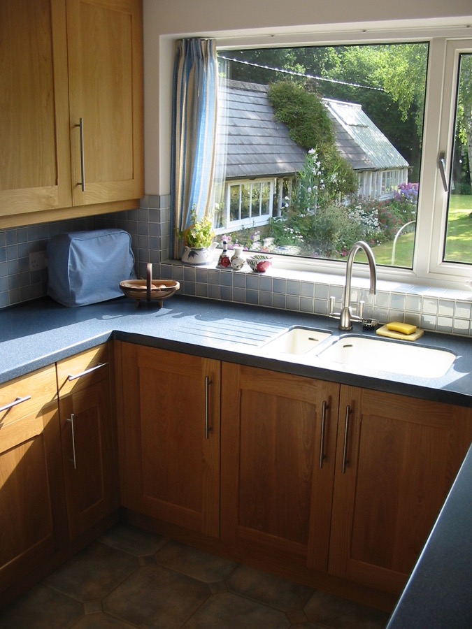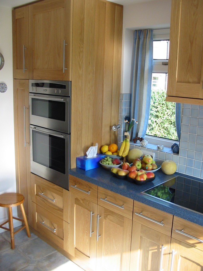 Oak kitchen with Corian worktops.