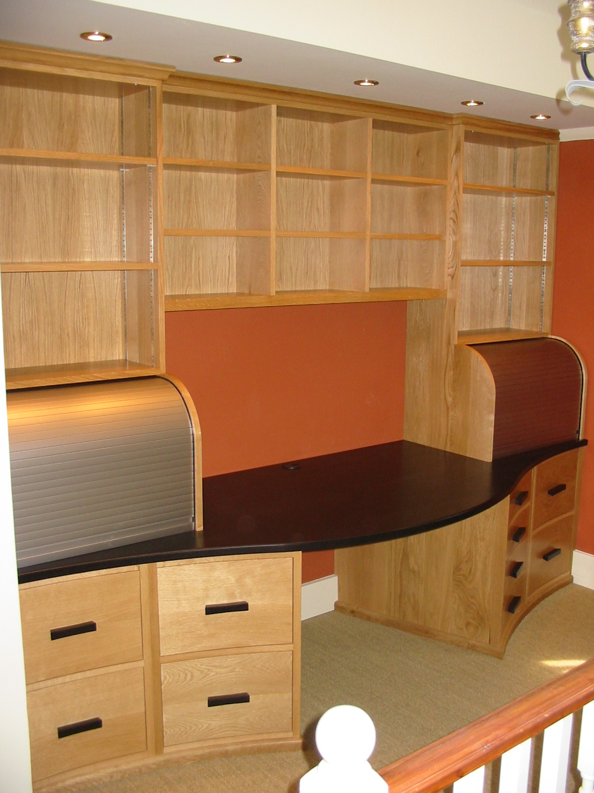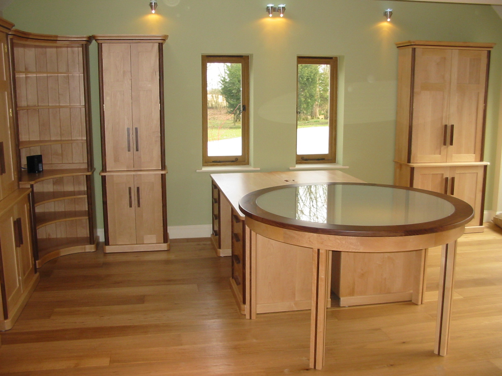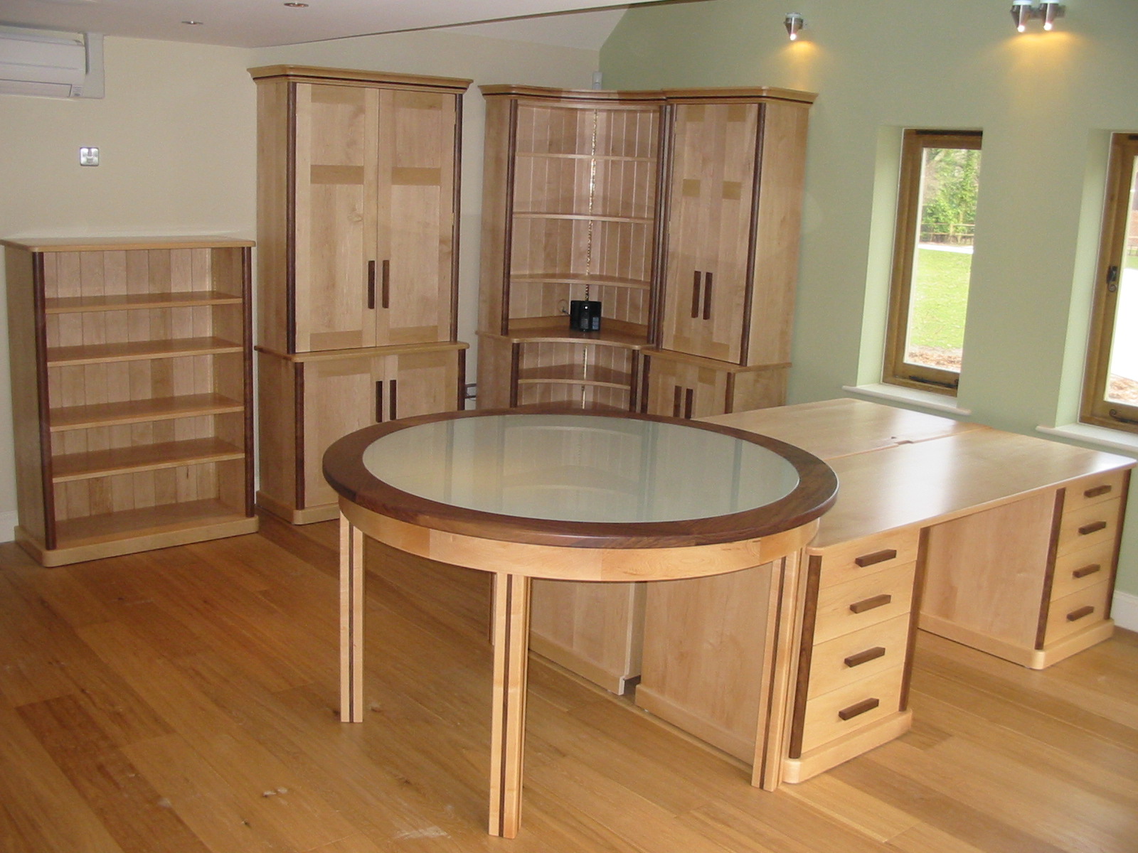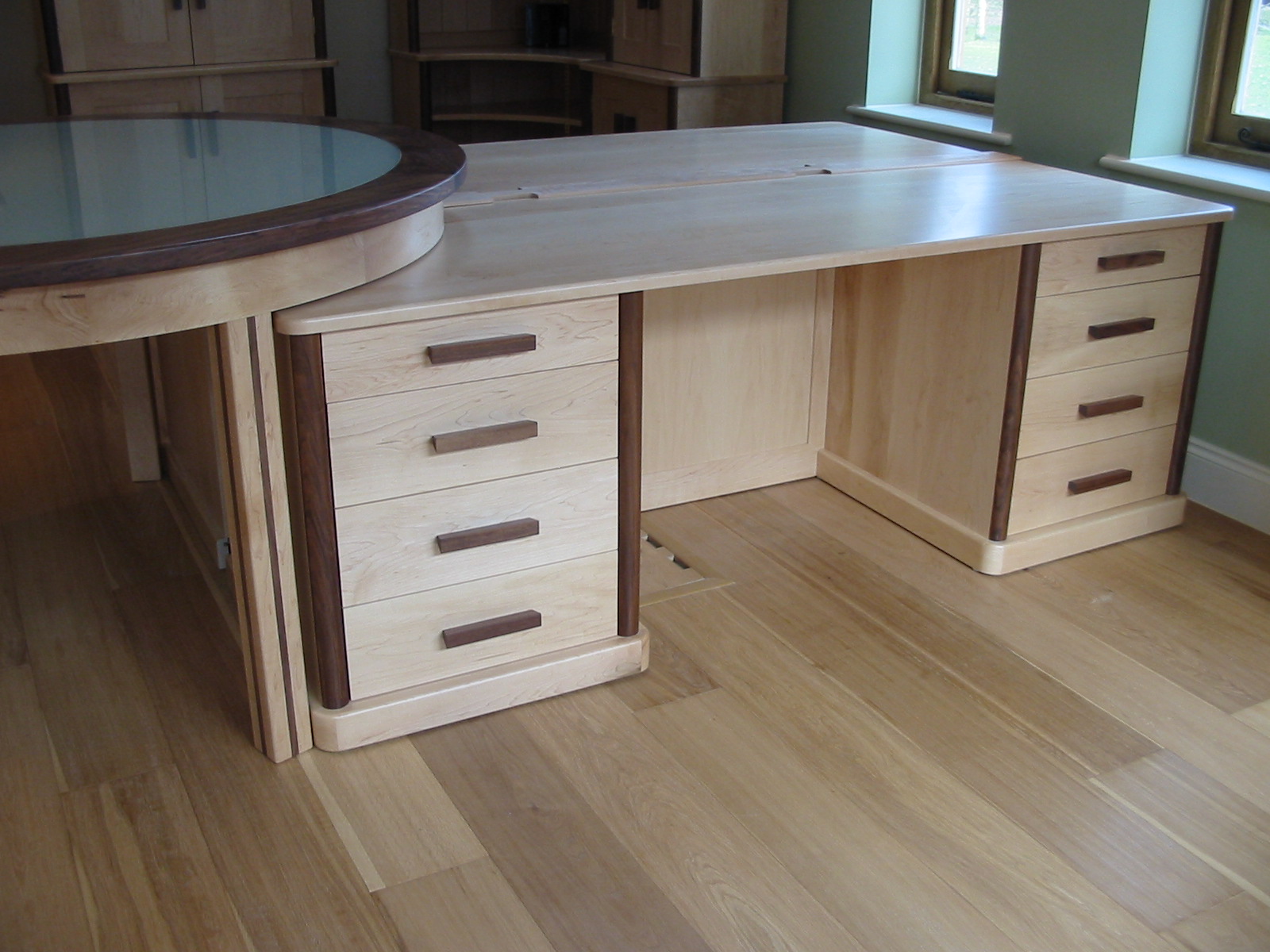 Maple and walnut office with glazed table. Oak desk with stained oak shaped top.